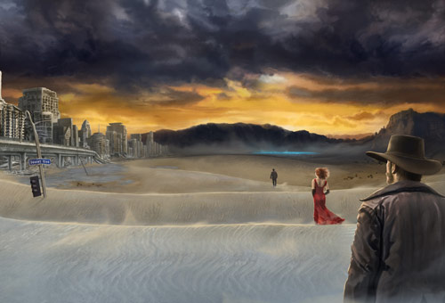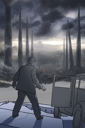 The publisher gave us pretty detailed notes. They wanted something that combined the fantastic elements of the story with the sweeping scale. I pushed for something "simple and classic" but I was unconvincing, possibly because of my lame Washington Monument cover concept. To meet the publisher's needs, Josh and I came up with this concept of Casper Cord standing on a broken highway, aghast at this alien vista of ruined spires. It was not based on any actual event in the novel, but it conveyed the concept. When we showed them this concept, about 30% complete, they were as aghast as poor Casper and told us to immediately stop. Josh and I were pretty disappointed because, hey, cool cover on the way.
